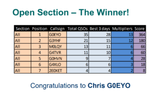 YQ0RN Radionostalgia – Brusturi- GB2ST Standedge Tunnel -GB2KDR Keith and Dufftown Heritage Railway Museum- GB1MHM Moseley Heritage Museum (not our Moseley) GB2SPY wasn’t in the official list but is a museum special event- GX3EFX The Forties Experience- GB2CPM Amberley Museum- GB0MFM Moira Furnace Museum-MX0WGS Wings Museum-GB0WFX (not Museum, but 110th anniversary of Northampton Club)- GB2RRM Ramsey Rural Museum- GB2ST Standedge Tunnel- GB0MMH (not Museum but Men’s Mental Health special event.)