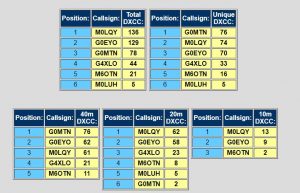 Lee G0MTN contacted 76 unique counties (each country counting only once across the three bands) while Ian M0LQY contacted 136 overall (the total of countries worked on each of the three bands).