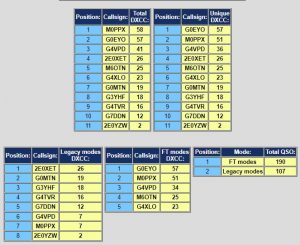 In the ‘all bands and modes’ section, Don G0NES made a spectacular charge to first place.  He secured this with 75 contacts with Club members and a clean sweep of the band, operating and mode bonuses.