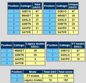 Digital mode operators managed 190 qsos against 107 for legacy modes.  The operator contacting the greatest number of unique DXCC entities (Chris G0EYO) was using FT8.  He achieved 57 countries against the highest placed legacy mode operator – John 2E0XET – with 26.