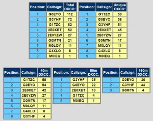 Congratulations to Chris G0EYO and Neil G1TZC for topping the total DXCC and unique DXCC tables. Neil also just pipped Chris in the 40 meter tables.