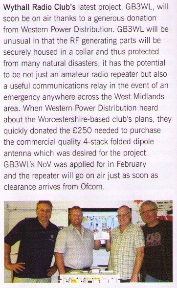 The September edition of RadCom is now hitting doormRadCom pieceats across the UK as we write and so news of our impending repeater, GB3WL will also be getting out, as you can see from the snippet. The article appears on page 84 but if you click on the picture of the article (left) you can have a sneak preview!